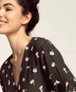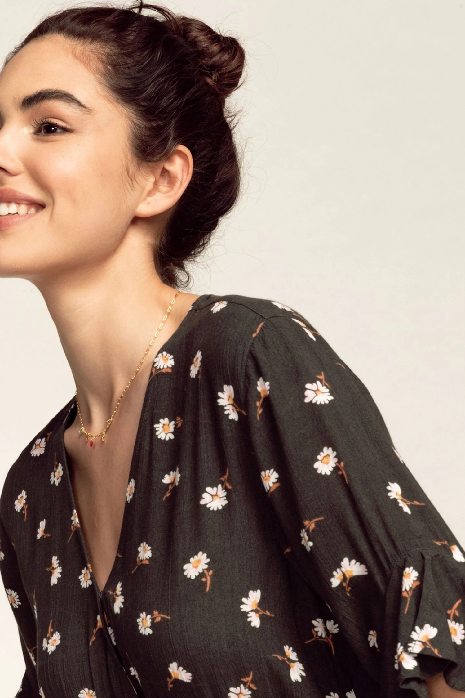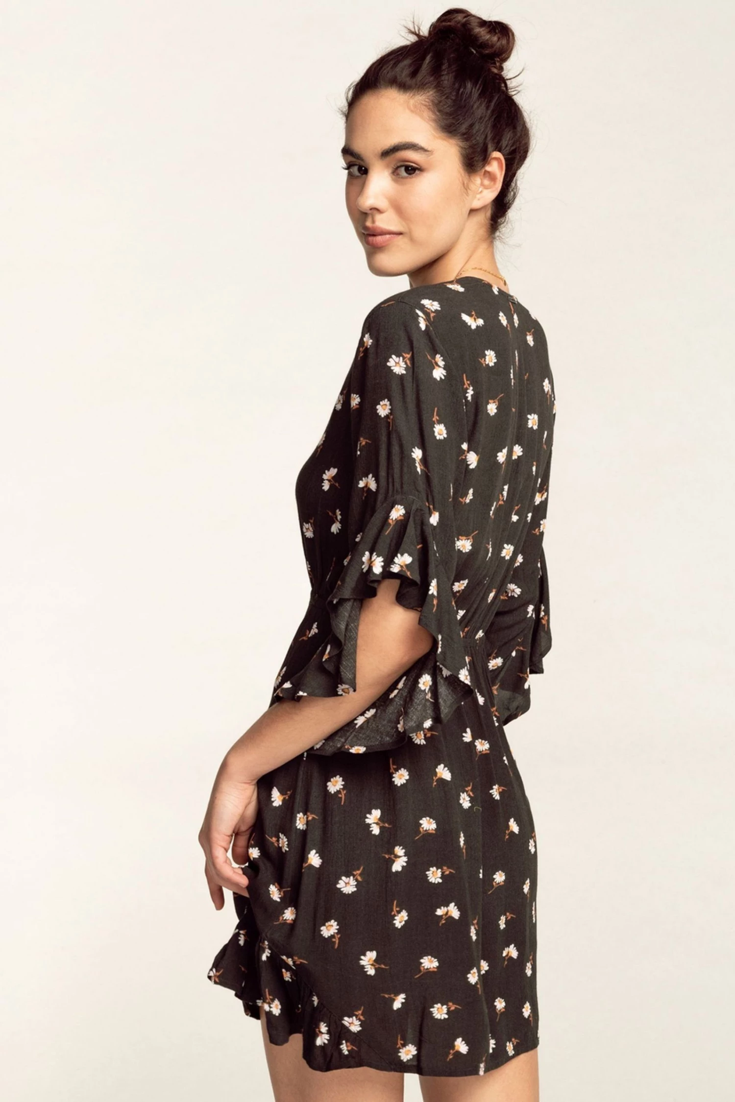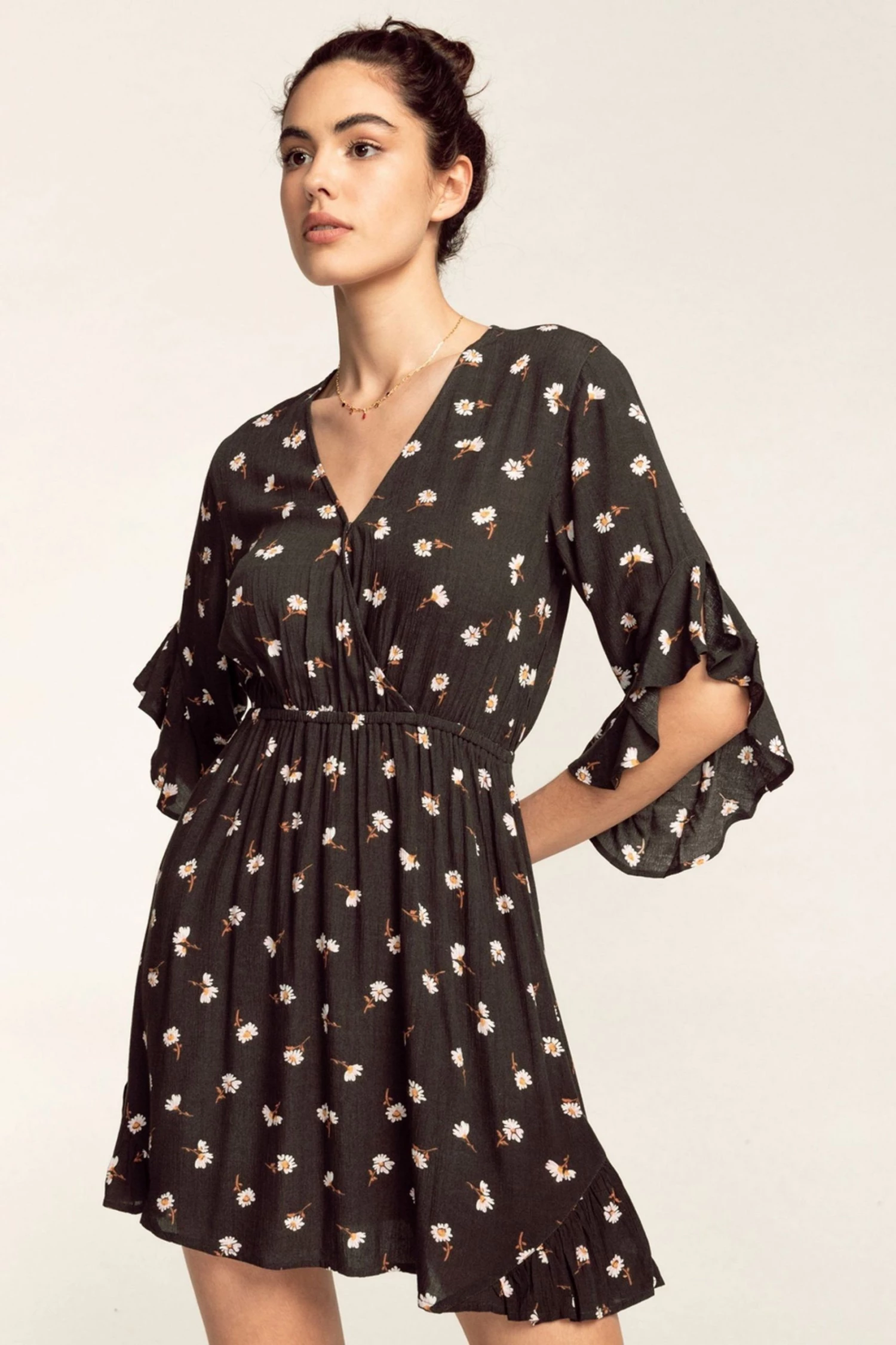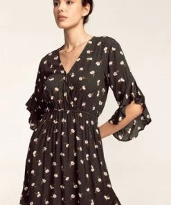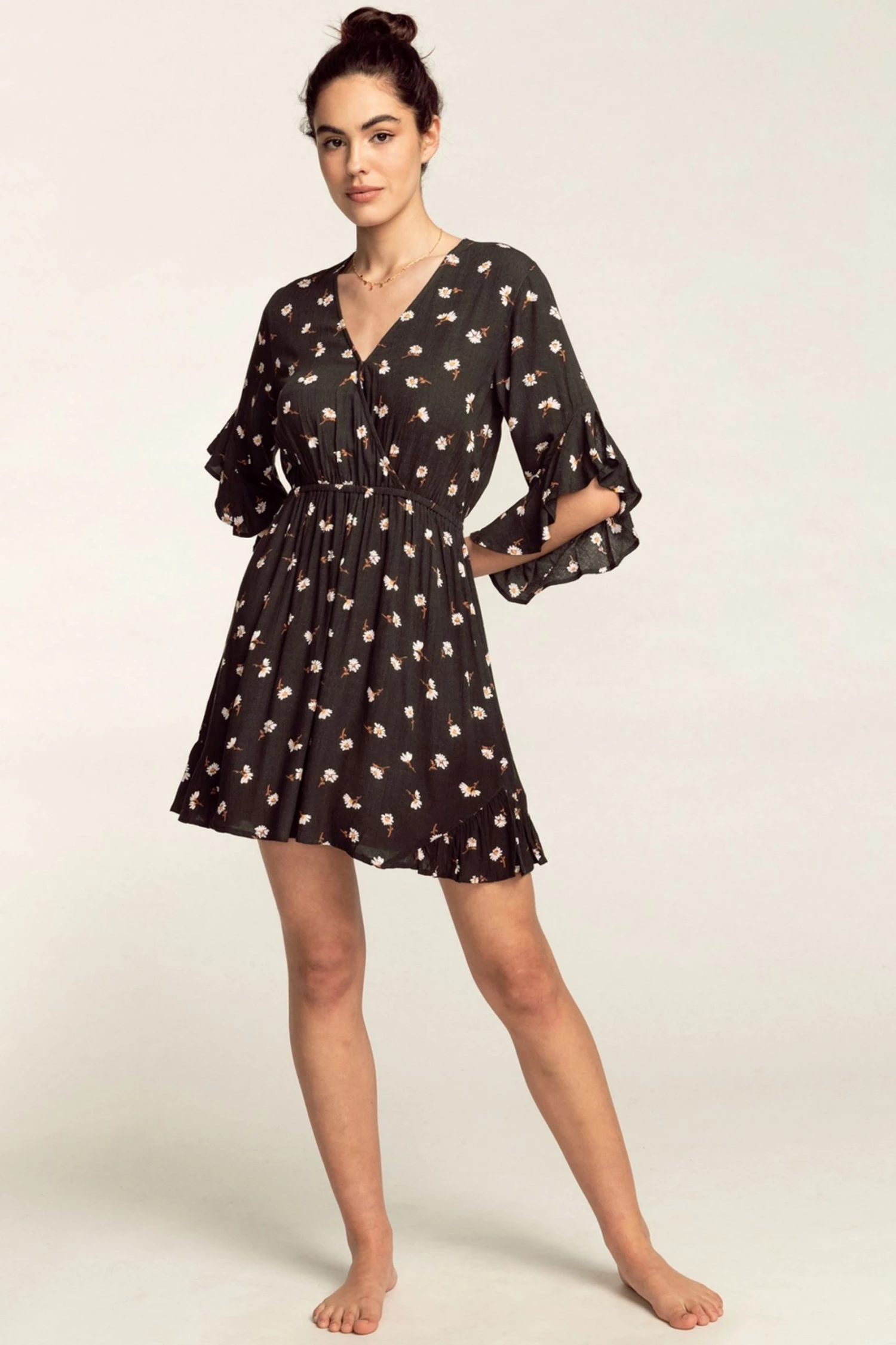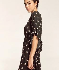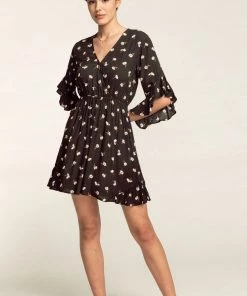 Dress for Women. Features include – all-over printed design. Cross over neck. Elasticated waist. Flounce sleeves.