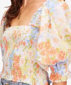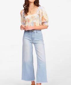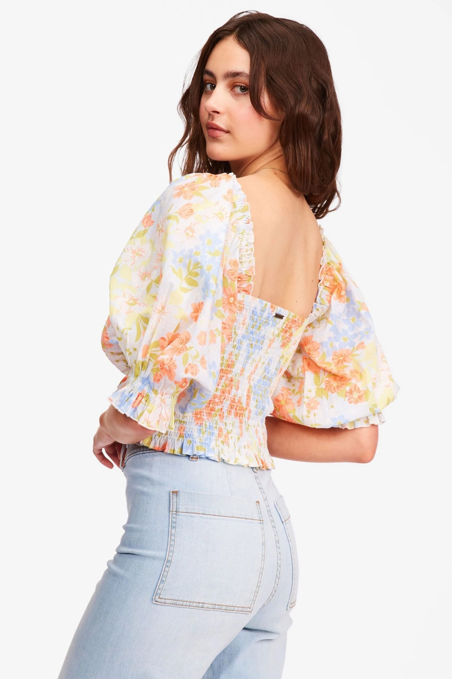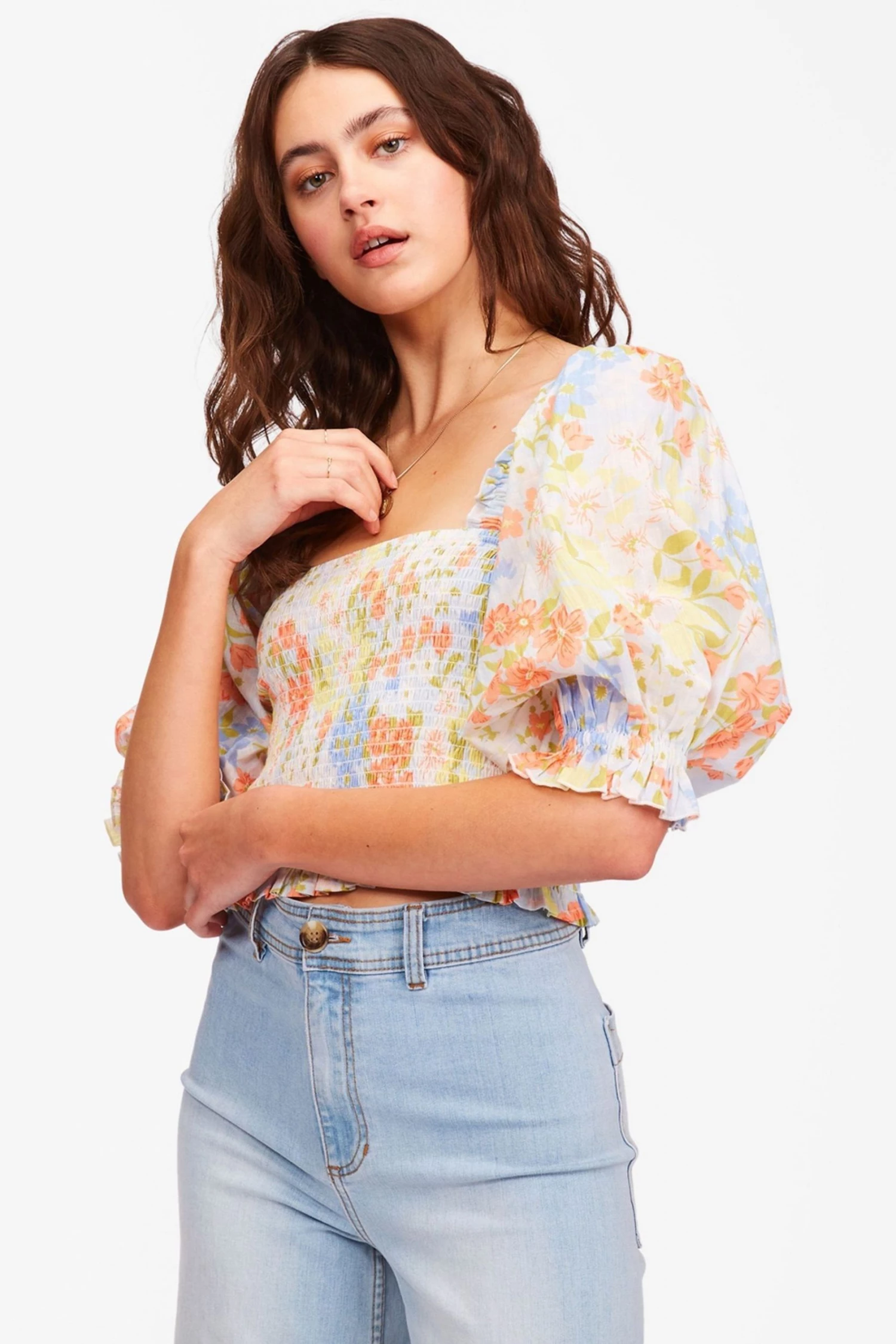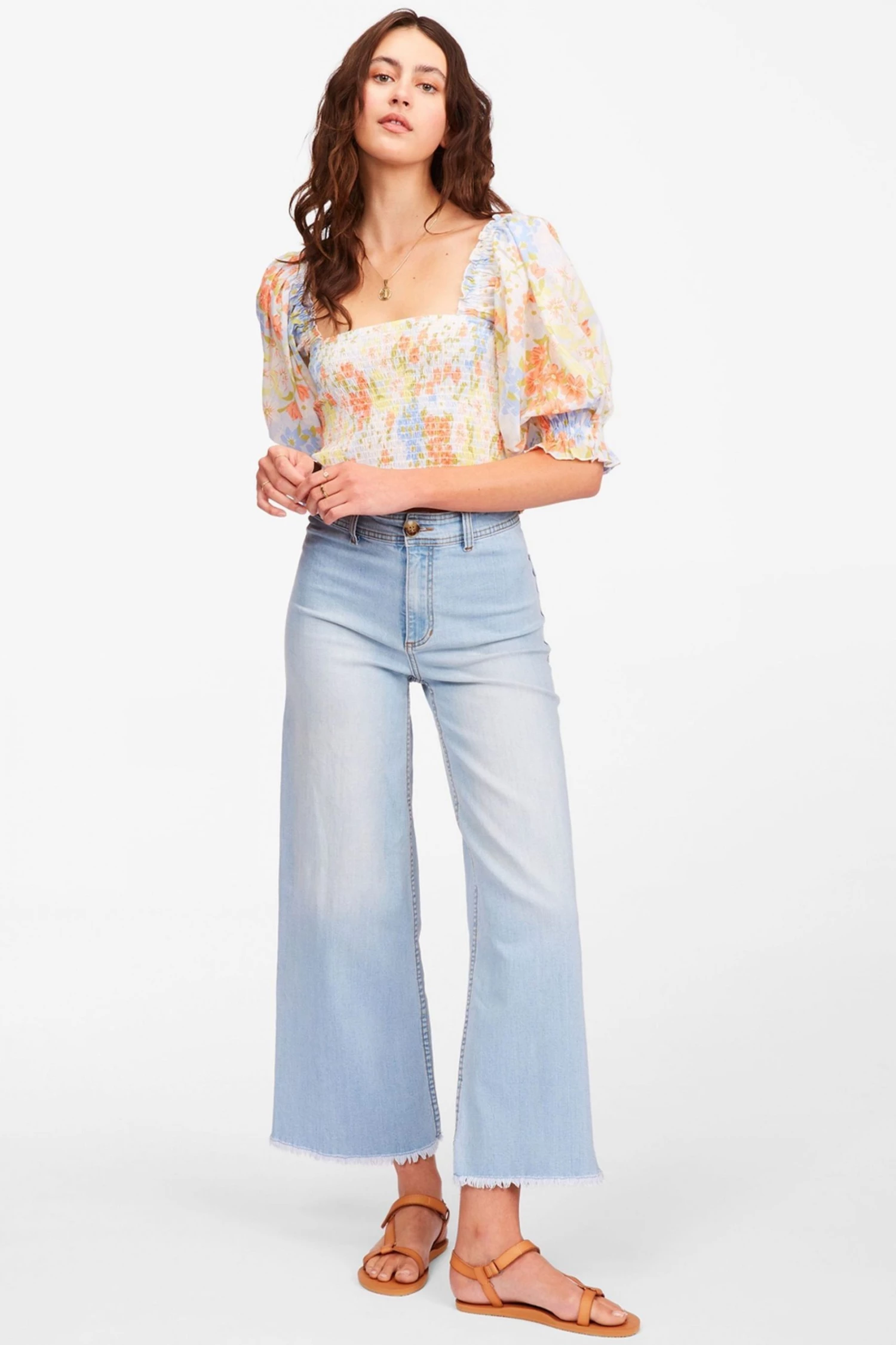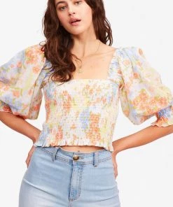 Crop Top for Women. Features include: horizon cotton slub fabric, cropped, figure hugging fit, blouson sleeve with ruffle detail, straight neckline, metal branding plate, and smocked bodice.