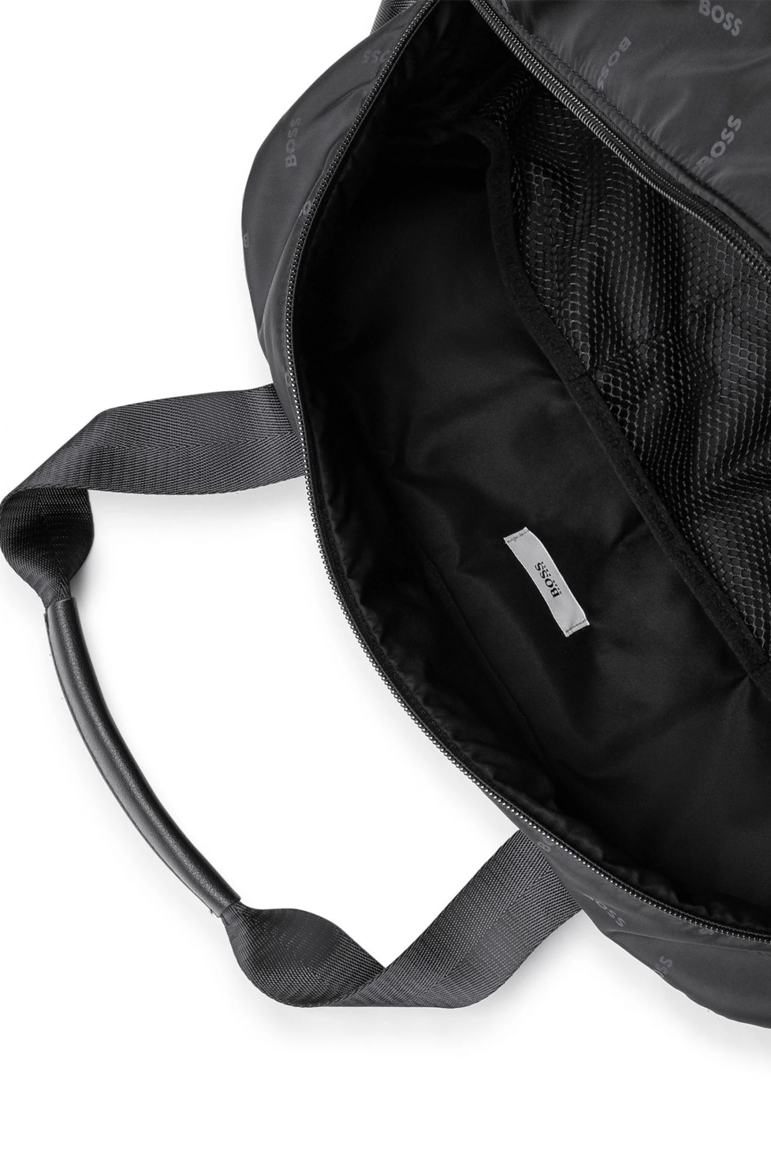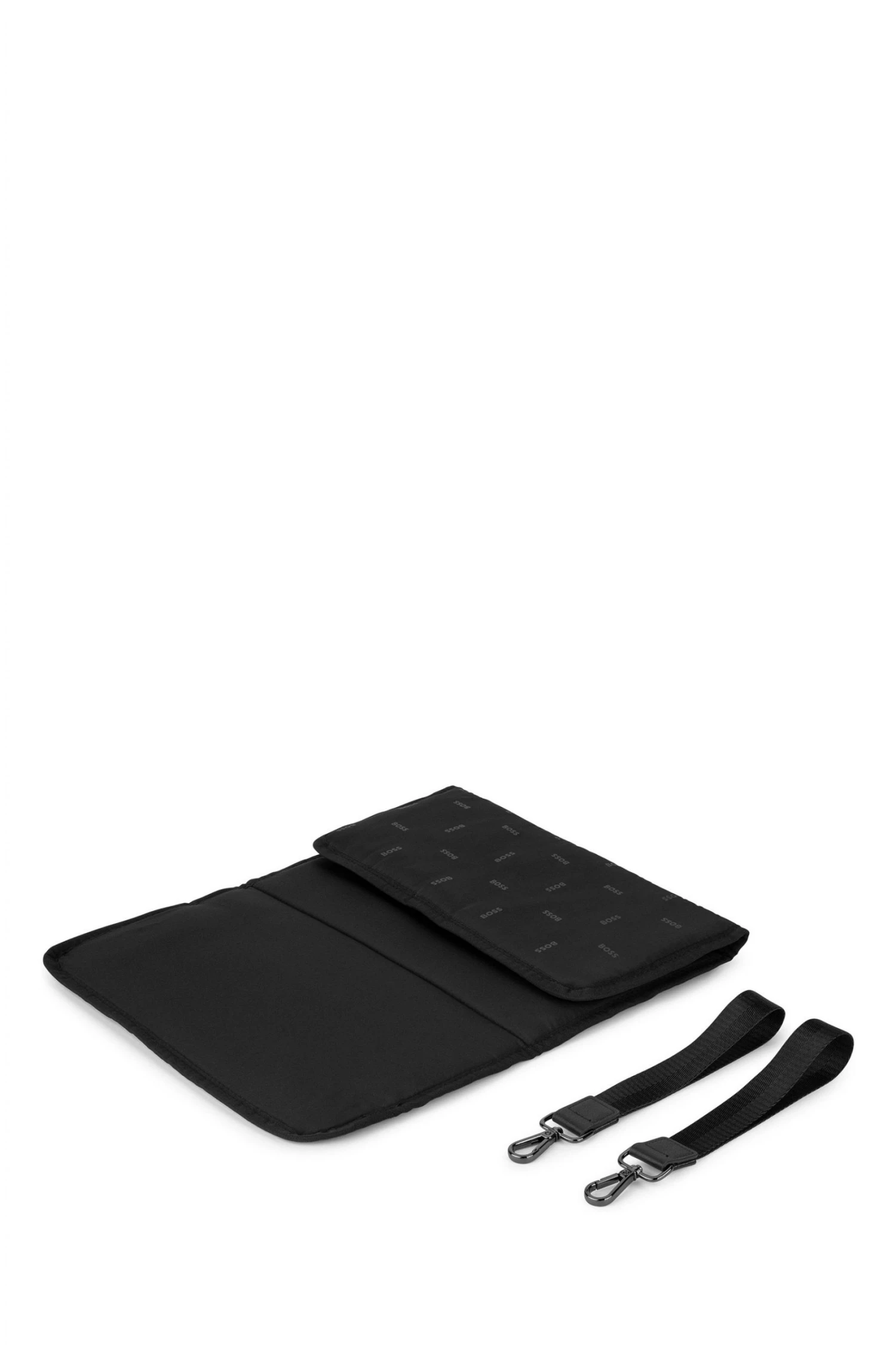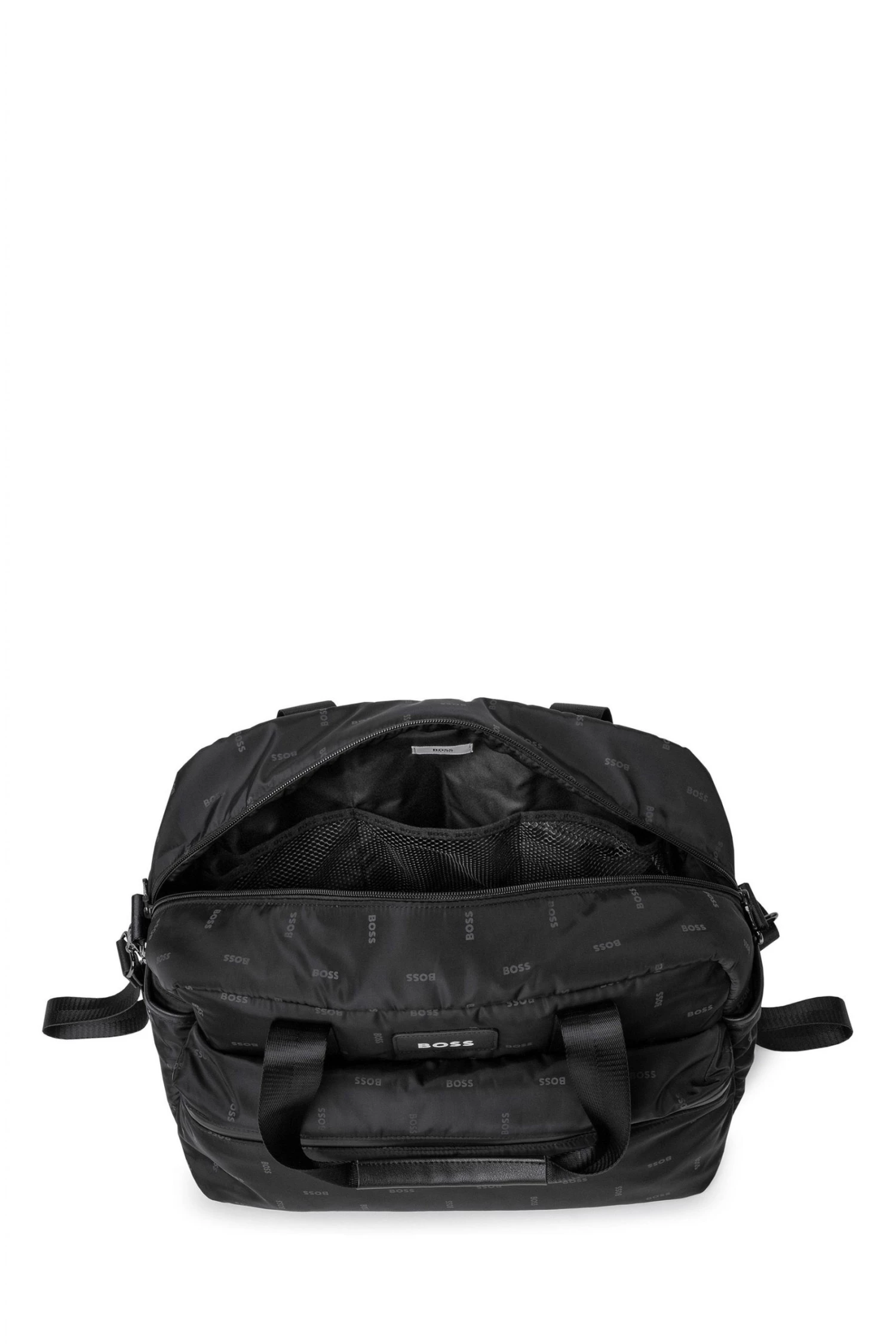 Allover changing bag in polyester. Changing mat with two stroller straps and removable strap. External large pockets. Large zip fastener. Rubber-finishing zip on front. Inside compartments. Branded patch on front.