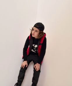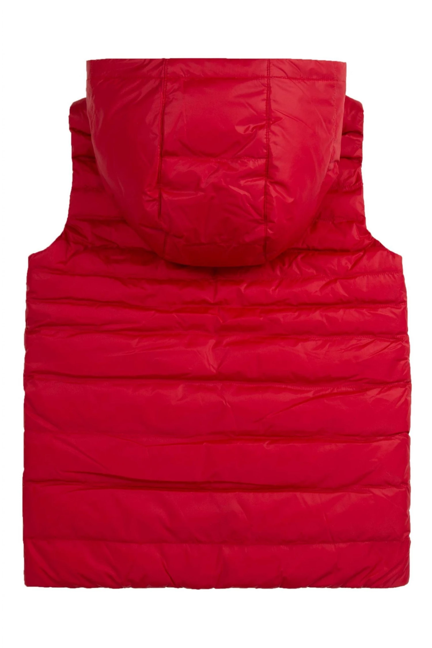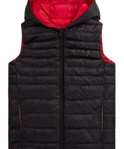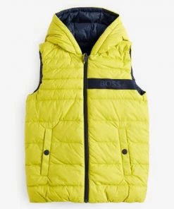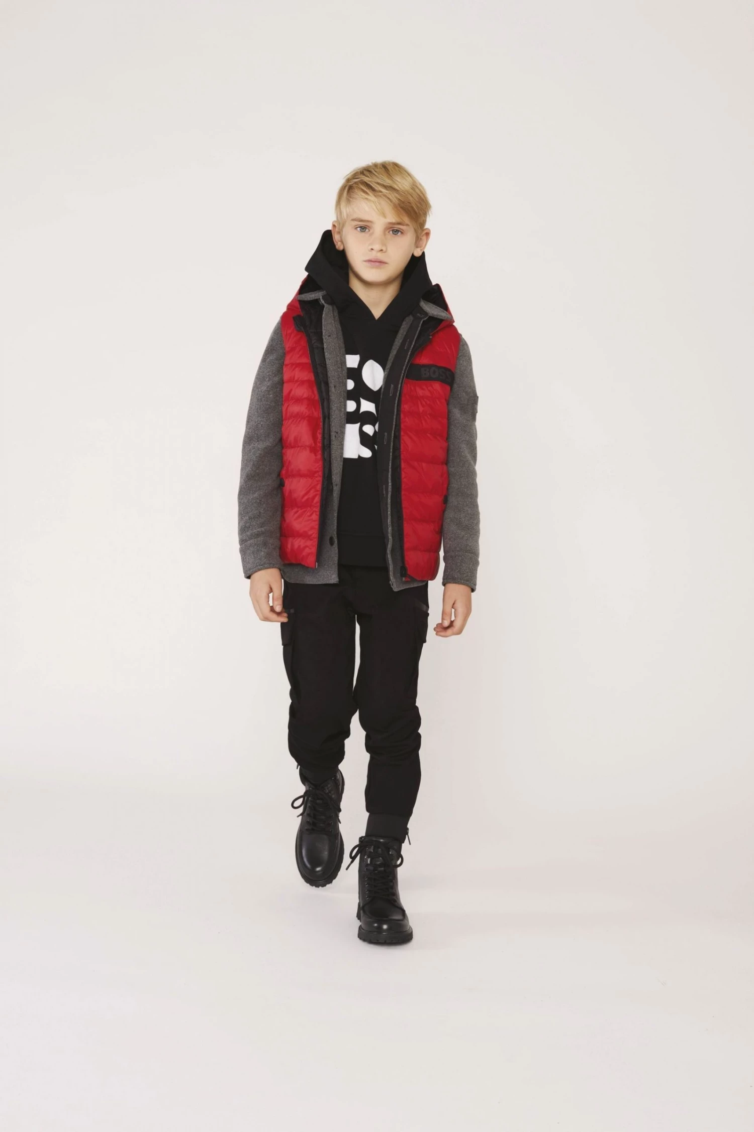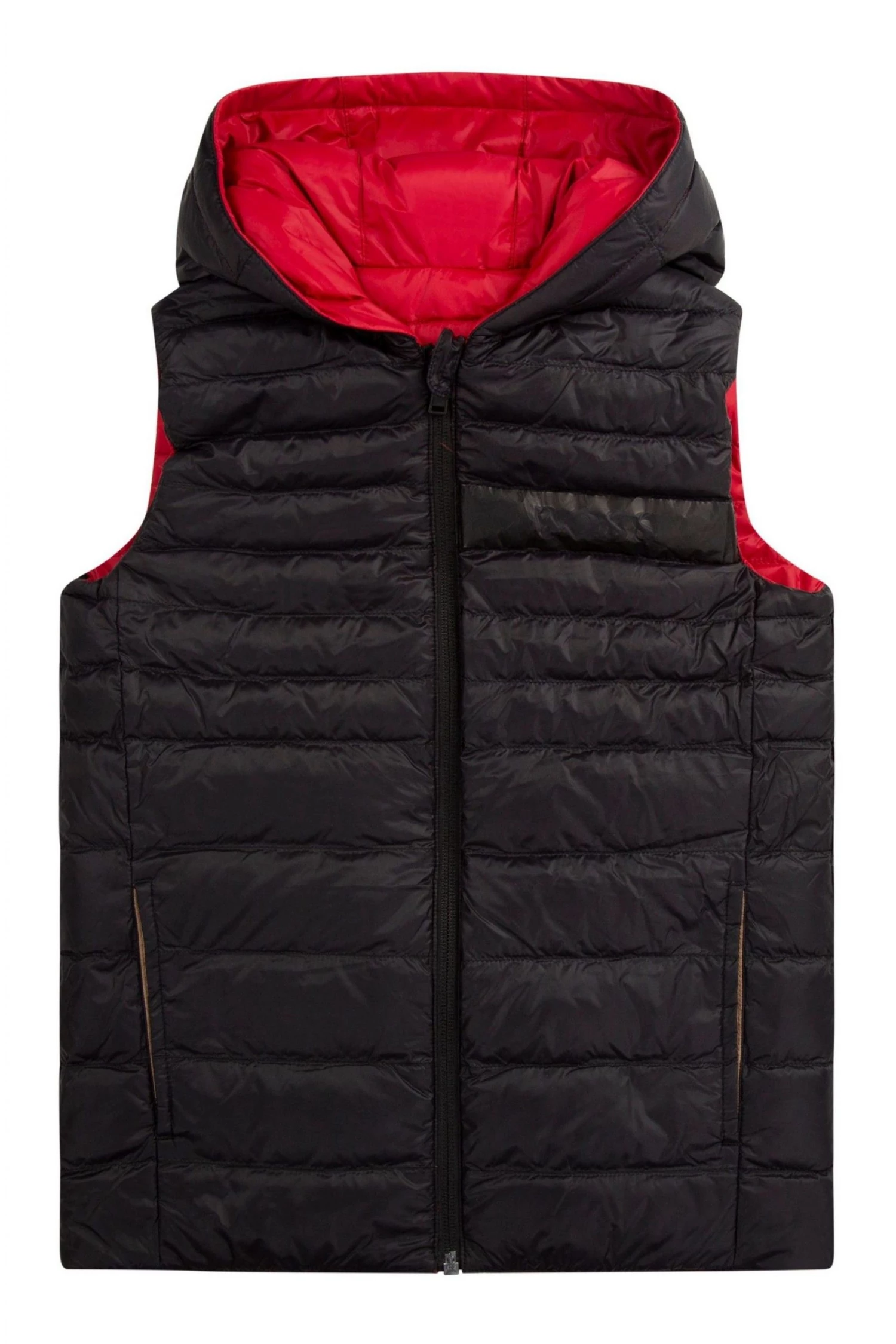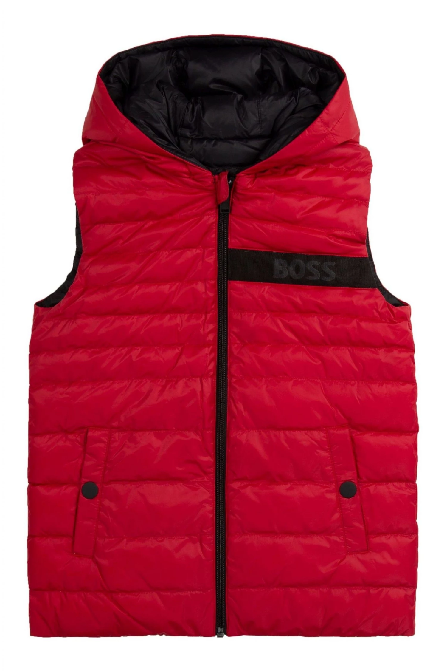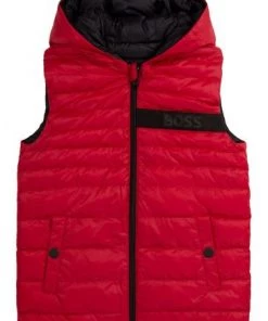 Made of 100% polyamide, this hooded sleeveless down jacket is a repellent. Featuring white padding 90% down 10% feather of animal origin goose and duck, reversible, zip fastener, pockets on both sides, band with “BOSS” jacquard on the chest.
