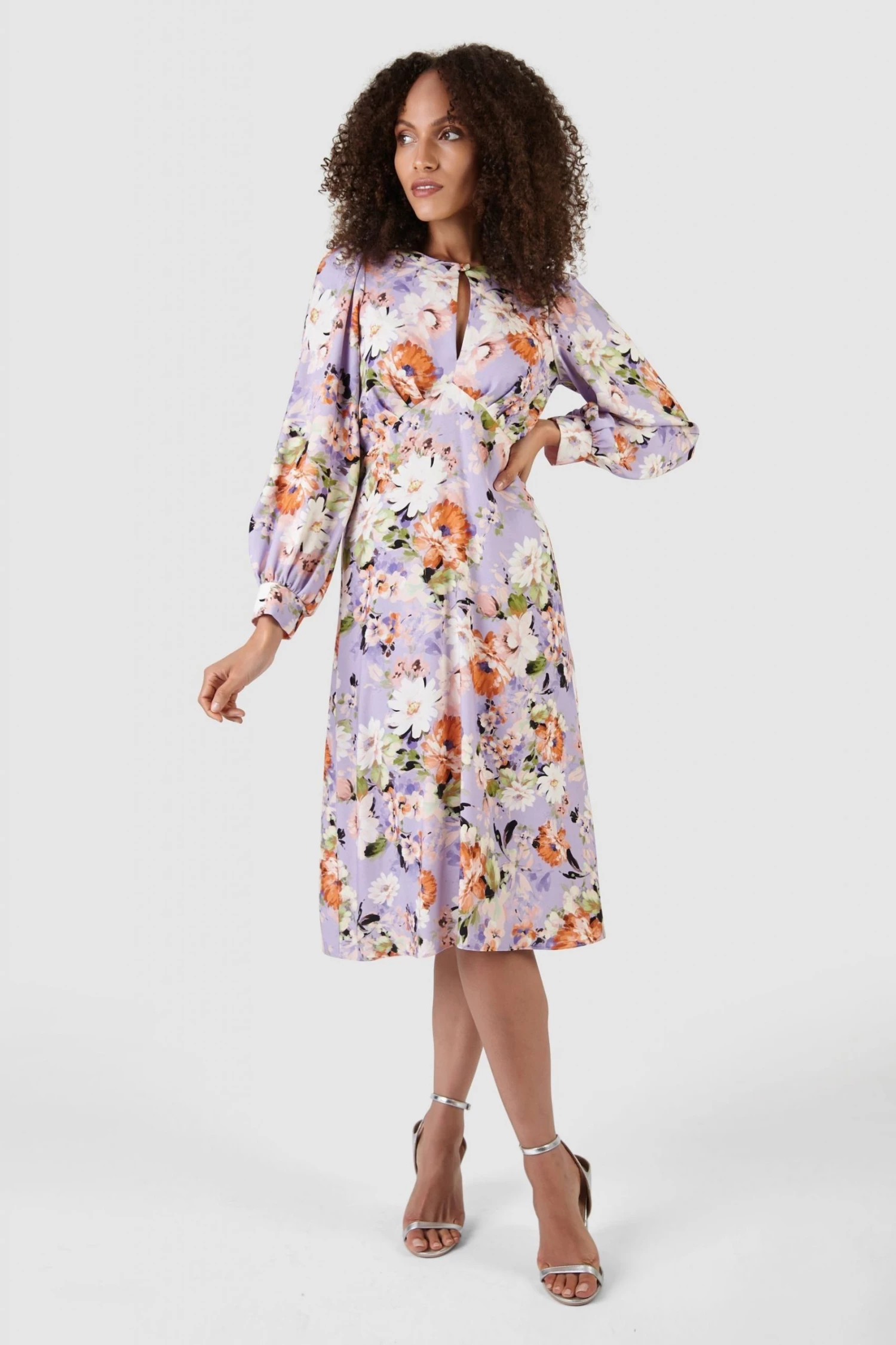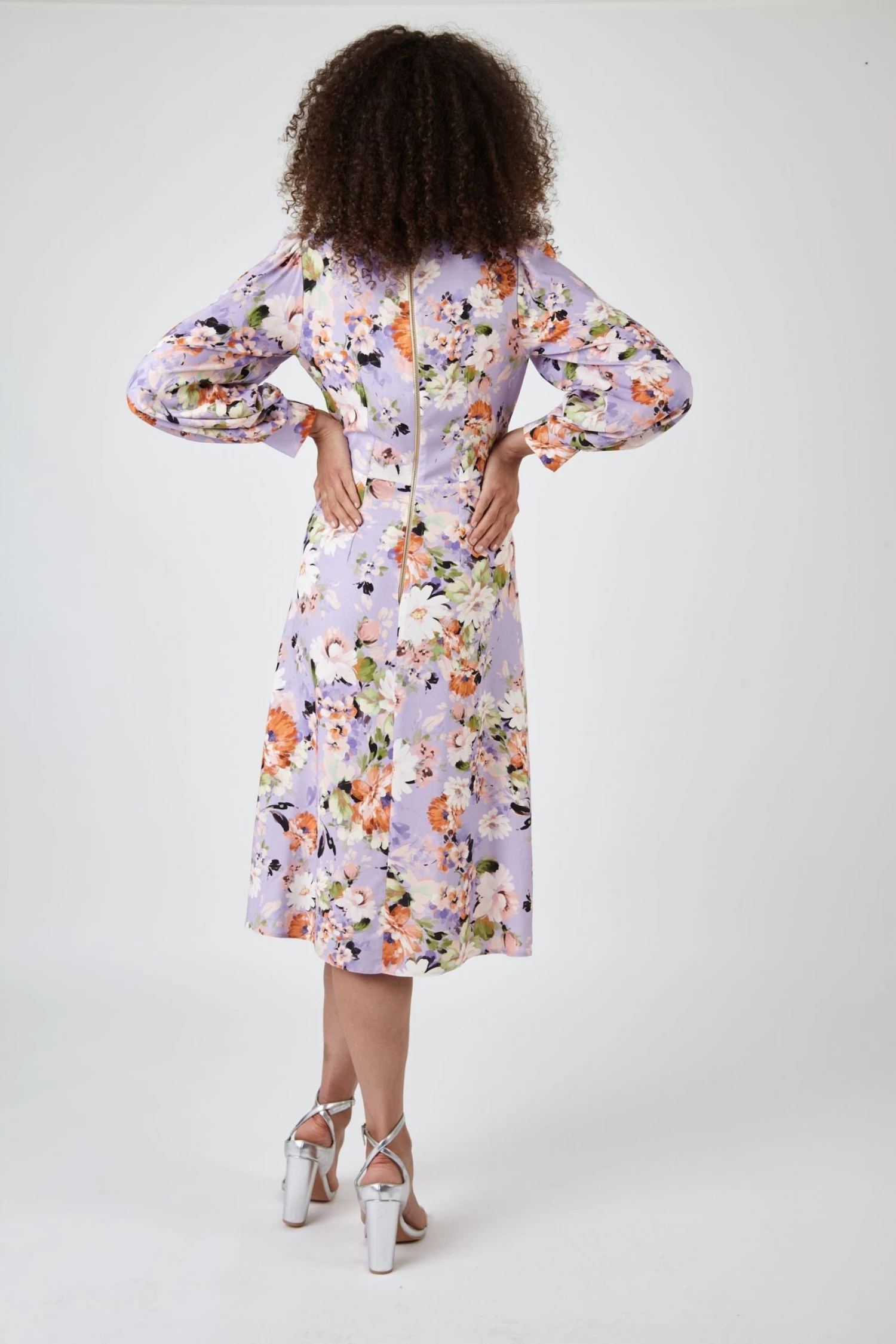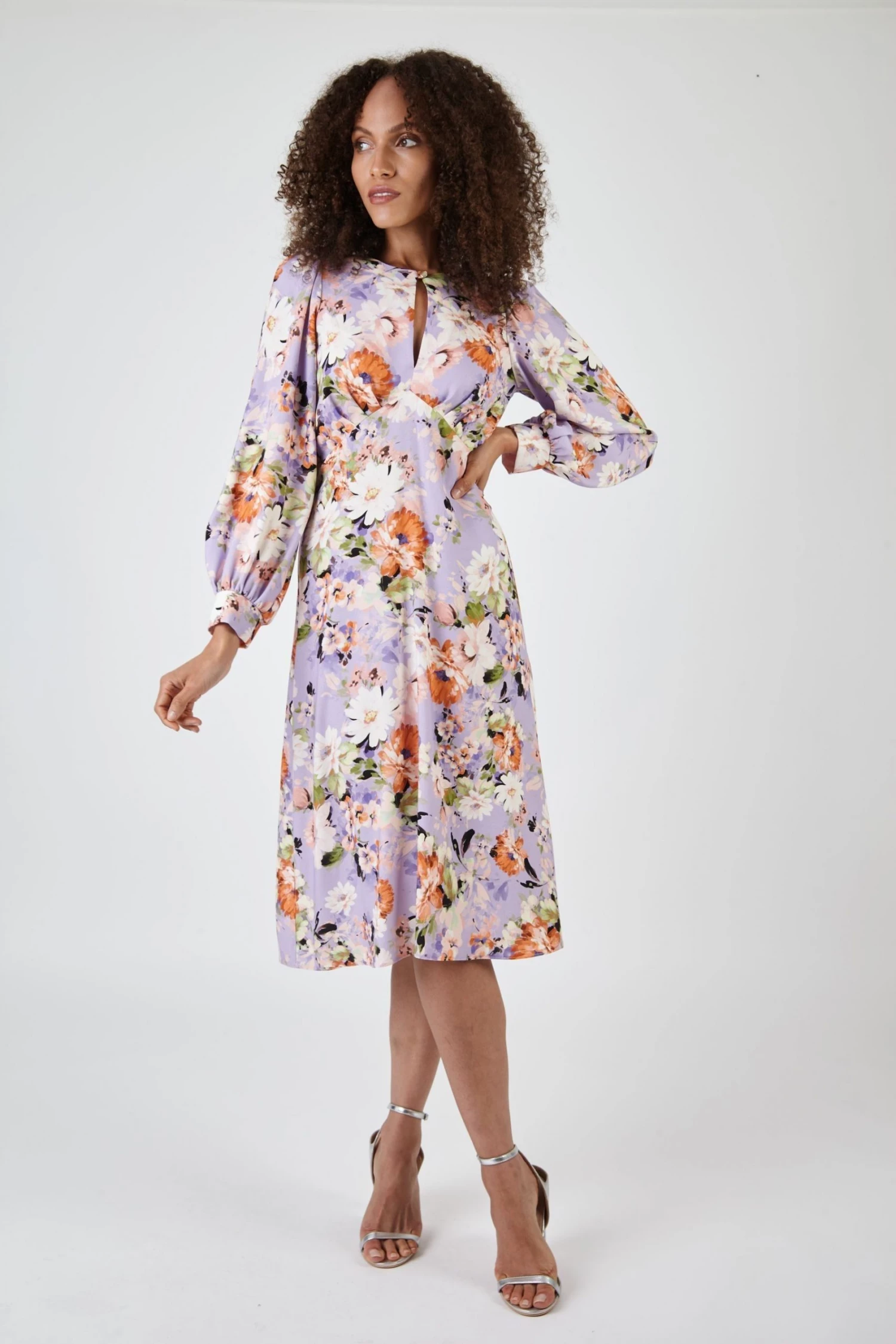 A super versatile style that is easy to dress up or down, this Closet London tea dress is designed with a gorgeous floral print in Lilac with . Made for a flattering fit that gathers at the bust and Statement Puff Sleeves.