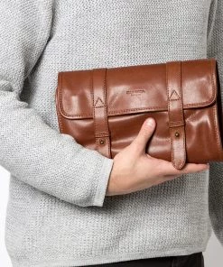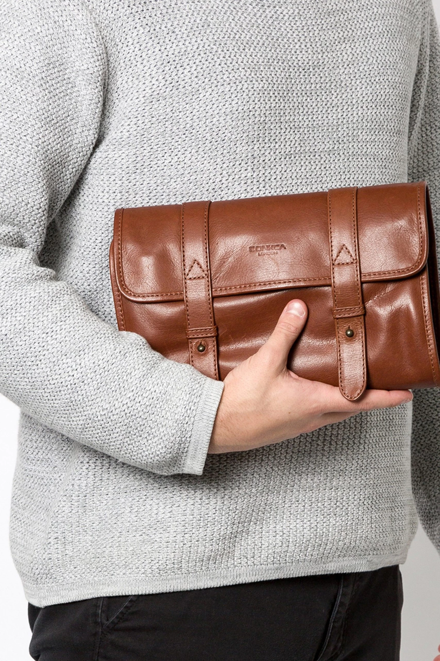 The ‘Mere’ washbag is handcrafted from natural leather for a handsome finish and features two pin fasteners which attach to leather straps. Includes a gun metal hook on the inside of the washbag for hanging up. Two zipped pockets compliment a zipped main section which provides ample storage space for all your toiletry essentials. This washbag is elevated by the intricate and distinct stitching, giving it a sophisticated yet rugged look alongside the embossed Conkca logo on the exterior, for a handsome finish.